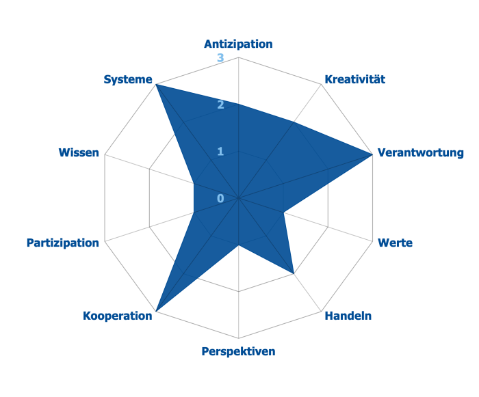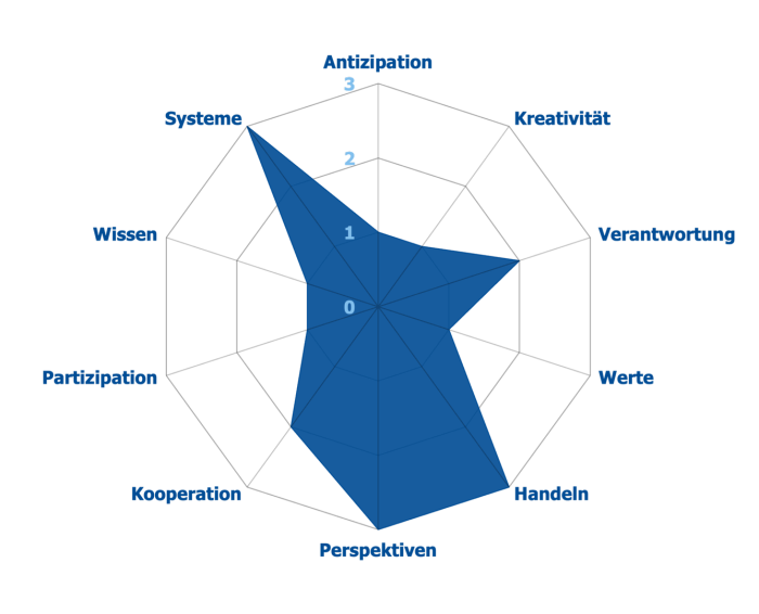 - Werte: Sich eigener und kollektiever Denkweisen, Werte und Normen, Haltungen und Handlungen sowie deren Ursprünge bewusst sein und diese in Hinblick auf eine Nachhaltige Entwicklung beurteilen