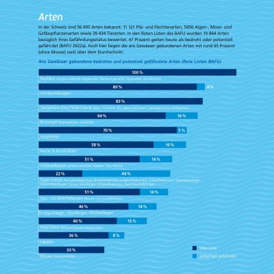 Rund 65 Prozent der ans Gewässer gebundenen Arten gelten in der Schweiz als bedroht oder potentiell gefährdet. Massnahmen, die ihre Lebensräume wiederherstellen, artenspezifische Massnahmen oder auch Sensibilisierungskampagnen helfen, sie zu schützen und zu fördern.