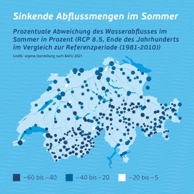 Höhere Temperaturen und sinkende Abflussmengen während Hitzeperioden im Sommer setzen Fischen und anderen Wasserlebewesen zu. Um sie zu schützen, braucht es Anpassungen der Fliessgewässer und ihrer Ufer an den Klimwandel. Wichtig sind zum Beispiel die Beschattung von Bächen oder das Schaffen von tiefen Stellen, in denen das Wasser kühl bleibt.