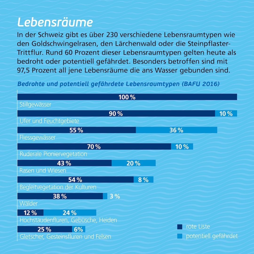 Gewässerlebensräume gelten als die am stärksten bedrohten Lebensräume der Schweiz. Moore haben zwischen 1900 und 2010 82 Prozent ihrer Fläche eingebüsst. Bei den Auen sind es seit 1850 sogar über 90 Prozent. 100 Prozent der Stillgewässer-Lebensraumtypen stehen auf der Roten Liste und bei den Fliessgewässern gelten lediglich noch rund fünf Prozent als mehr oder weniger intakt. Das ist zu wenig und hat zu einem dramatischen Artensterben in und entlang unserer Gewässer geführt. Die Schweiz kann es sich nicht länger leisten, intakte Gewässerlebensräume an die Stromproduktion, die Landwirtschaft oder die Siedlungsentwicklung zu verlieren.