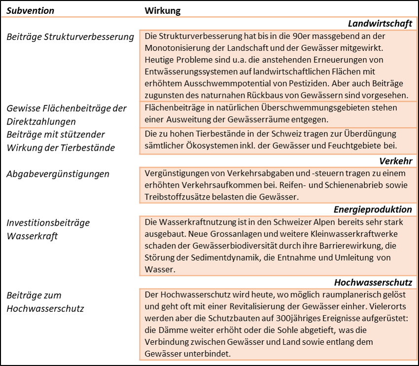 Biodiversitätsschädigende Subventionen vergünstigen die Produktion oder den Konsum und erhöhen damit den Verbrauch natürlicher Ressourcen. Sie führen zu Verschmutzung, Störung sowie zum Verlust von Lebensräumen und darin lebender Arten sowie ihrer Vielfalt (Valsecchi 2009). Eine Studie der Eidgenössischen Forschungsanstalt WSL und der Akademie der Naturwissenschaften hat 2020 über 160 dieser Subventionen identifiziert und beschrieben (Gubler et al. 2020). Die Subventionen stammen aus acht verschiedenen Bereichen. Im Folgenden wird exemplarisch aufgezeigt, wie mit Subventionen politische Ziele verfolgt werden, die der Gewässerbiodiversität schaden.