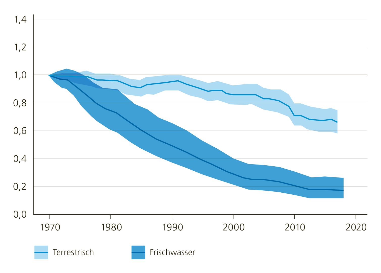 Die Biodiversität der Süsswasserorganismen hat in den letzten 50 Jahren weltweit mit alarmierender Geschwindigkeit abgenommen. Einer aktuellen Schätzung zufolge sind die überwachten Süsswasserpopulationen seit 1970 um 83 Prozent zurückgegangen – deutlich schneller als terrestrische Populationen (WWF 2022) (Abb. 2). Die Wanderfischpopulationen sind beispielsweise weltweit um 74 Prozent eingebrochen, in Europa sogar um erschütternde 93 Prozent im Durchschnitt (Deinet et al. 2020). Wissenschaftler haben vor dieser Biodiversitätskrise im Süsswasser gewarnt (Albert et al. 2020) und Empfehlungen erarbeitet, um sie zu stoppen (Tickner et al. 2020).