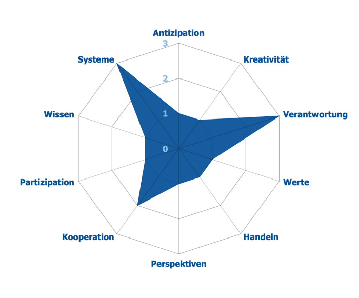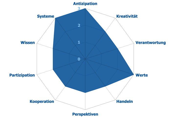 - Werte: Sich eigener und kollektiever Denkweisen, Werte und Normen, Haltungen und Handlungen sowie deren Ursprünge bewusst sein und diese in Hinblick auf eine Nachhaltige Entwicklung beurteilen