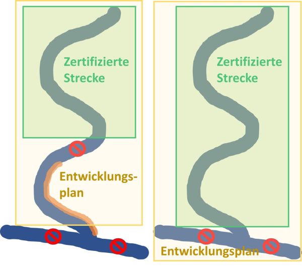 Abb.1: Beispiel einer Aufwertung im Rahmen des Gütesiegels «Gewässerperle PLUS». Links: Erstzertifizierung. Der obere Abschnitt des Gewässers ist zertifiziert. Im Rahmen des Entwicklungsplans verpflichtet sich die Trägerschaft, das Wanderhindernis und die Uferverbauungen im Unterlauf zu beseitigen. Rechts: Rezertifizierung nach fünf Jahren. Der Entwicklungsplan wurde umgesetzt, Wanderhindernis und Uferverbauung im Unterlauf sind behoben. In der Folge wird der Unterlauf ebenfalls zertifiziert. Im neuen Entwicklungsplan verpflichtet sich die Trägerschaft, die Beeinträchtigungen im Mündungsgewässer zu beheben.
