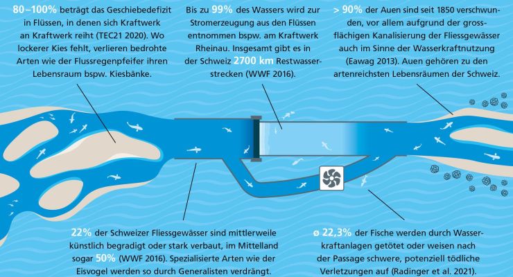 Die Flüsse und Bäche der Schweiz sind stark vom Menschen geprägt. Sie wurden begradigt, eingedämmt, aufgestaut und unter die Erde verlegt. Dabei sind natürliche Lebensräume verlorengegangen und viele Gewässer können nicht mehr alle ihrer Funktionen erfüllen. Dazu zählen die Bereitstellung von Nahrung, Trink- und Brauchwasser, die Minderung von Naturgefahren, die Funktion als Erholungs- und Bildungsort und funktionierende Nährstoffkreisläufe. Daher ist es wichtig, verbleibende, natürliche Lebensräume zu schützen oder Abschnitte von Fliessgewässern zu revitalisieren. Etliche Kantone und Gemeinden planen aufgrund der Vorgaben des revidierten Gewässerschutzgesetzes aktuell Hochwasserschutz- und Revitalisierungsprojekte. Dies ist eine grosse Chance für unsere Gewässer.