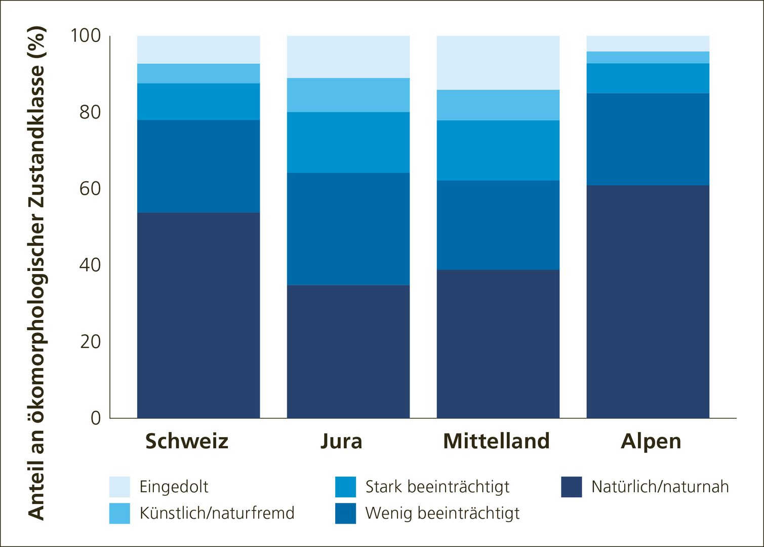 Im Laufe der Jahrhunderte haben sich die Süsswasserökosysteme in der Schweiz stark verändert. Seit dem 18. Jahrhundert hat die Nutzung und Regulierung der Wasserressourcen erheblich zugenommen. Zunächst waren hierfür vor allem Hochwasserschutzmassnahmen und Flussbegradigungen zur Schaffung von landwirtschaftlichen Flächen und zum Schutz von Siedlungsgebieten verantwortlich. Ab dem 19. Jahrhundert begann das Land mit dem Bau von Staudämmen und Wehren, hauptsächlich für die Wasserkraftnutzung. Die Nutzung der Wasserressourcen brachte sozioökonomische Vorteile auf Kosten der Umwelt. Schätzungen zufolge sind seit 1850 aufgrund der intensiven Wassernutzung und der Verbauung der Fliessgewässer rund 90 Prozent der Auen in der Schweiz verloren gegangen (Müller-Wenk, Huber, Kuhn, & Peter, 2004). Rund 20 Prozent der Schweizer Fliessgewässer sind künstlich angelegt, stark verändert oder eingedolt. Besonders ausgeprägt ist dieses Szenario im Mittelland und im Jura, wo dies auf rund 40 Prozent der Fliessgewässer zutrifft (Abb. 1).