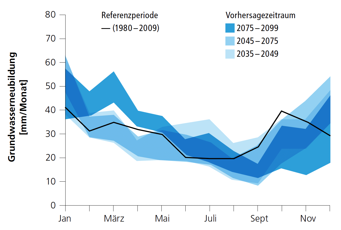 Wie bereits oben eingehend diskutiert, ändert sich unter zukünftigen klimatischen Bedingungen die jahreszeitliche Verteilung der Grundwasserneubildung. Die höheren Winterniederschläge führen jedoch nur an verhältnismässig feuchten Standorten und/oder bei Böden mit höherer Durchlässigkeit zu einer zusätzlichen Neubildung. An verhältnismässig trockenen Standorten und/oder bei Böden mit geringerer Durchlässigkeit wird der zusätzliche Winterniederschlag im Boden gespeichert, sodass er, noch bevor er den Grundwasserspiegel erreicht und zu Neubildung führen kann, durch erhöhte Verdunstung wieder verloren geht und/oder als Oberflächenabfluss abfliesst. Insgesamt konzentriert sich die Neubildung entsprechend stärker auf den späten Winter und das frühe Frühjahr. Der Effekt dieser Veränderungen auf die jährliche Neubildungsrate variiert stark zwischen den Standorten und Böden und reicht von keiner Veränderung der jährlichen Neubildung bis hin zu einer Verringerung um die Hälfte. Die grössten Veränderungen werden bei Böden mit einer verhältnismässig geringen Durchlässigkeit beobachtet.